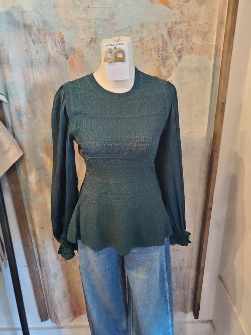 Teal Green Sweater Top with Pleat Sleeve Detail
