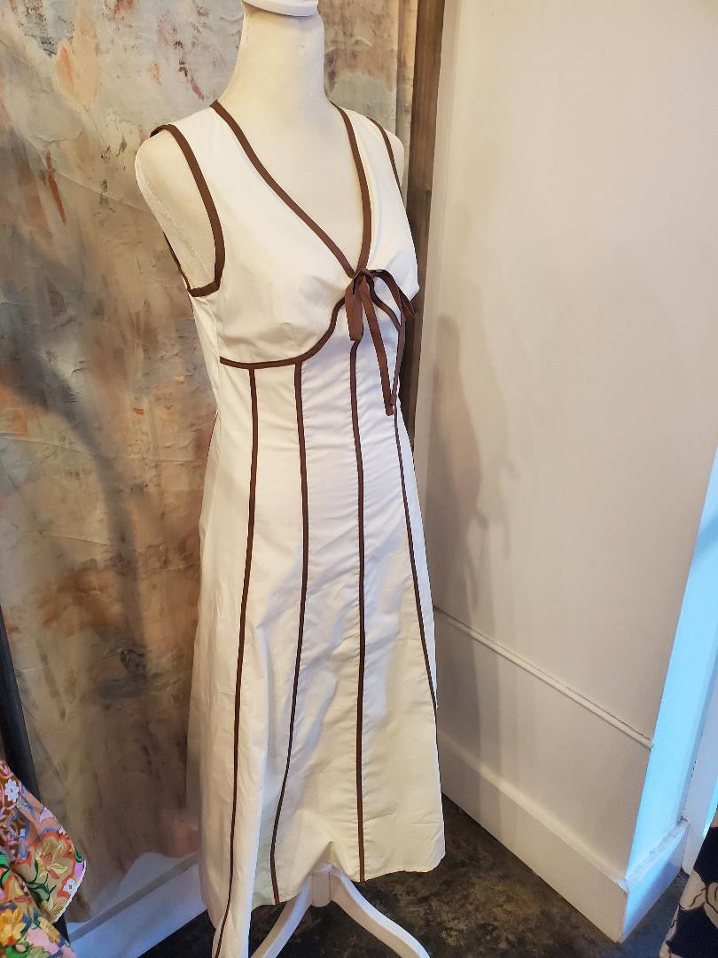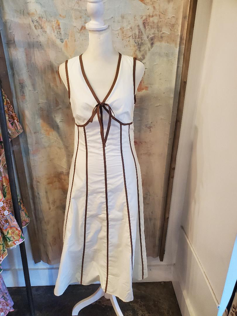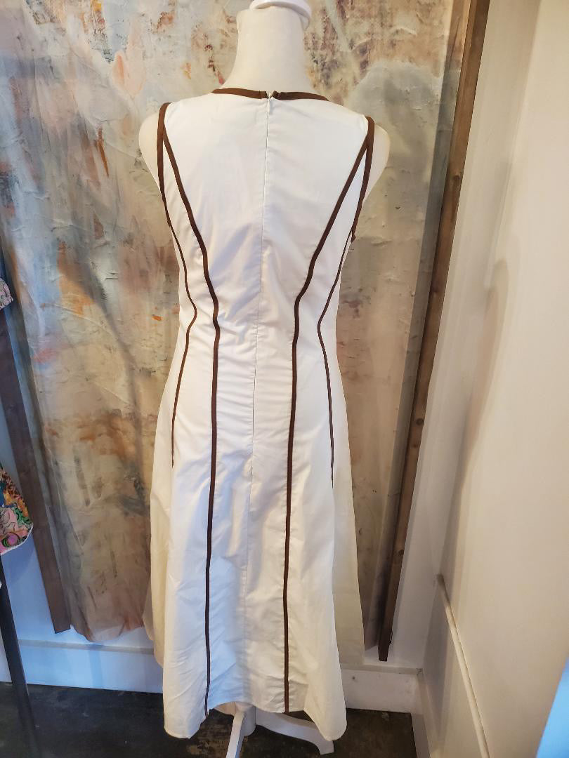 The Sleeveless Lined Midi Dress with Tie combines a streamlined silhouette with practical design. The absence of sleeves enhances breathability, while the lining provides comfort and structure. The tie detail allows for adjustable styling, accommodating varying body shapes and preferences for fit. Ideal for versatile wear throughout the seasons.