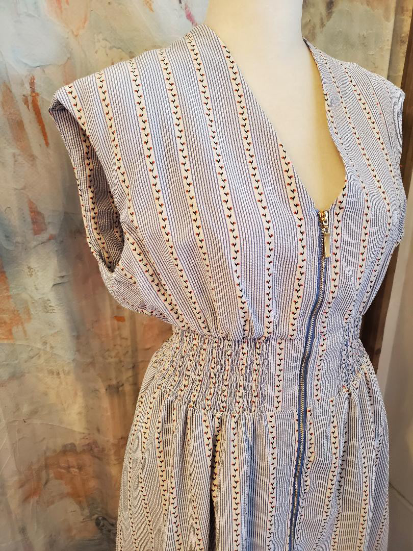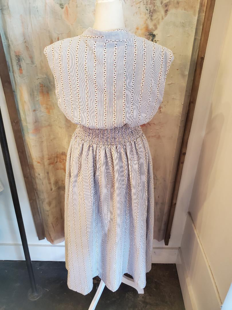 This sleeveless striped pattern dress features practical pockets, enhancing functionality without compromising style. The striped design can create the illusion of a slimmer silhouette, while the absence of sleeves allows for increased airflow, making it suitable for warmer climates. Ideal for casual or semi-formal occasions, its versatility is undeniable.