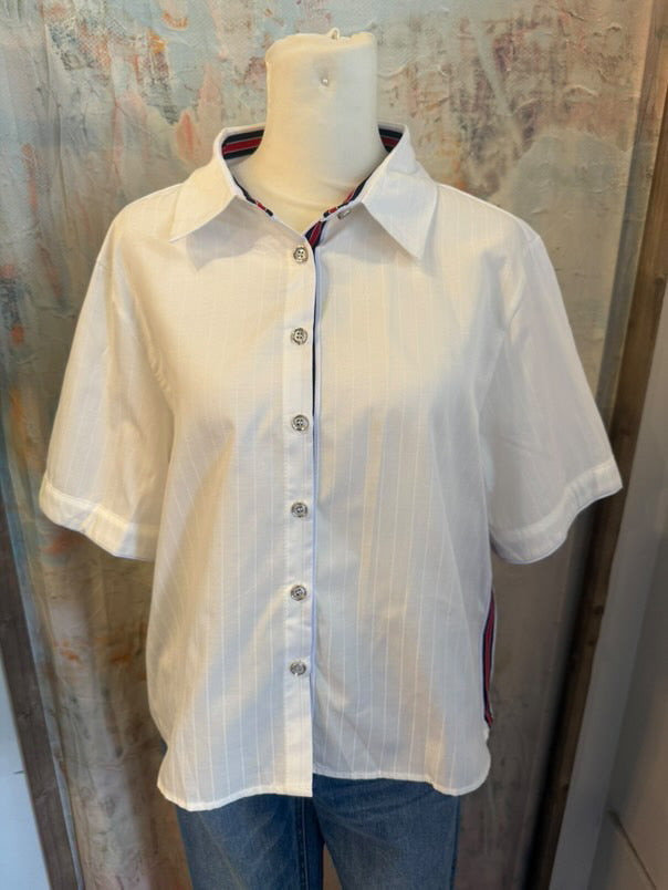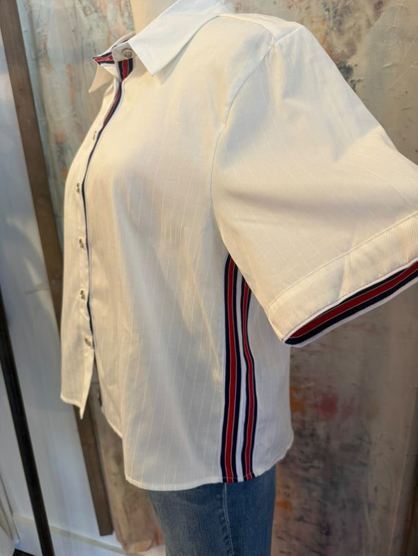 The Color Band Trim Accent Stripe Shirt combines a structured design with a modern aesthetic. Its color band trim enhances visual appeal while the stripe pattern adds depth. This shirt is suitable for both casual and formal settings, making it a versatile addition to any wardrobe.
