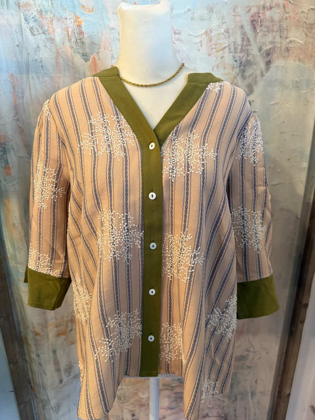 The Floral Embroidered Stripe Placket Top features intricate floral embroidery along a striped placket, providing a refined aesthetic. This design enhances versatility, making it suitable for both casual and semi-formal occasions. The top's quality construction ensures durability, while the embroidery adds a touch of elegance to any wardrobe.