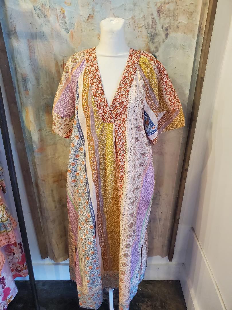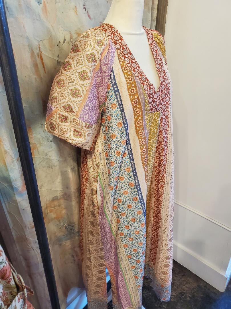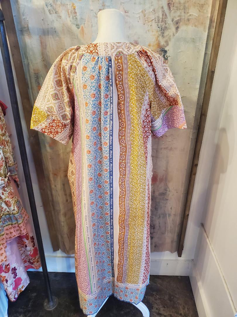 The Patchwork Print Kaftan Dress with Pockets combines versatile design with practical utility. Constructed from lightweight materials, it allows for breathability and comfort throughout the day. The inclusion of pockets enhances functionality, making it suitable for various occasions while maintaining an effortlessly stylish appearance.