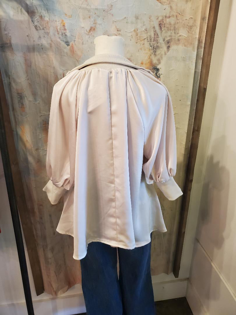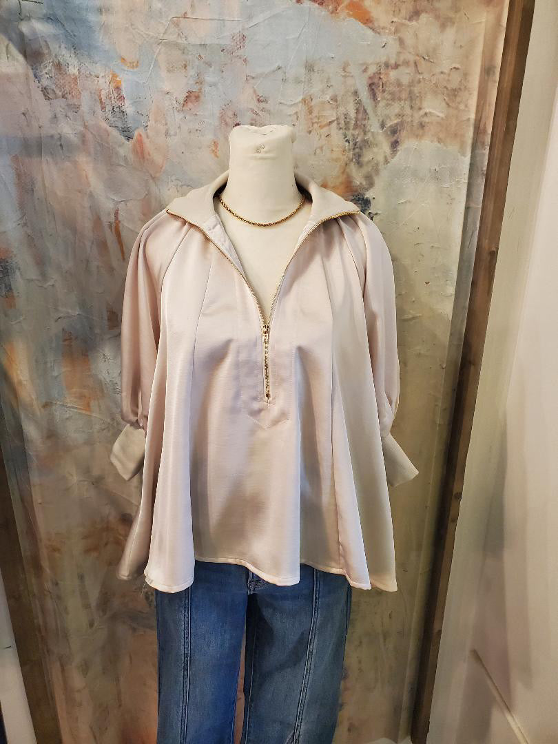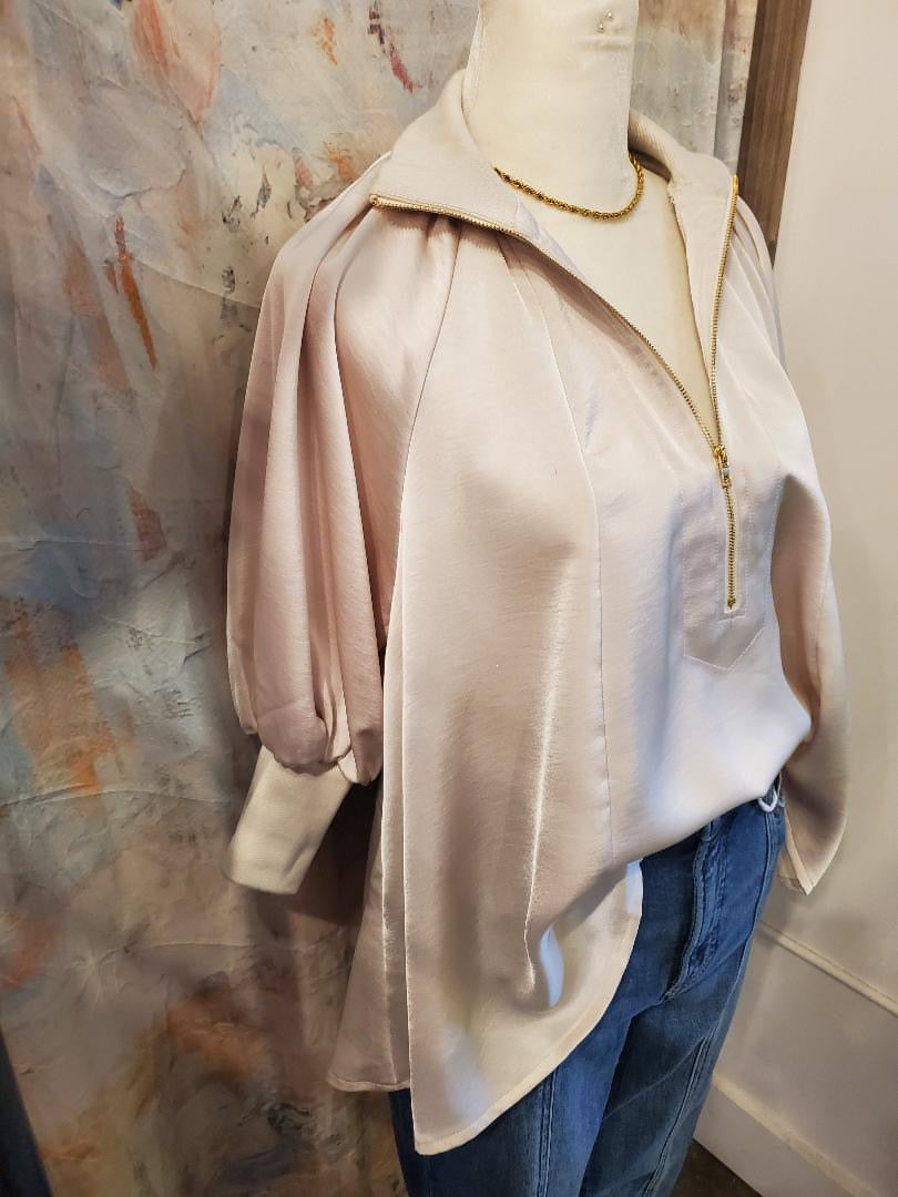 This stylish blouse features a zip front band and puffed sleeves, creating a sophisticated and trendy look. Made with high-quality material, it offers both comfort and style for any occasion. Elevate your wardrobe with this versatile and modern piece.