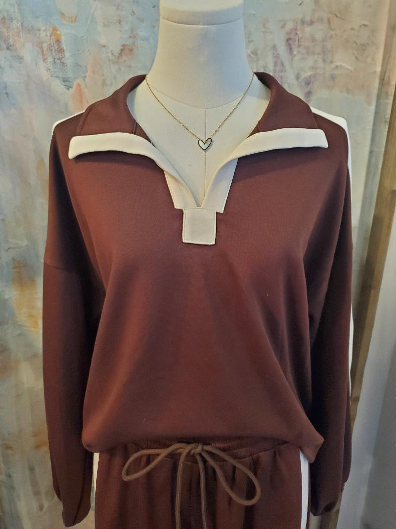Introducing our Brown Stripe Detail Long Sleeve Top. Made with soft and comfortable fabric, this top features a classic brown stripe design and long sleeves. It's perfect for adding a touch of elegance to any outfit. With its versatile style and quality craftsmanship, this top is a must-have addition to your wardrobe.
