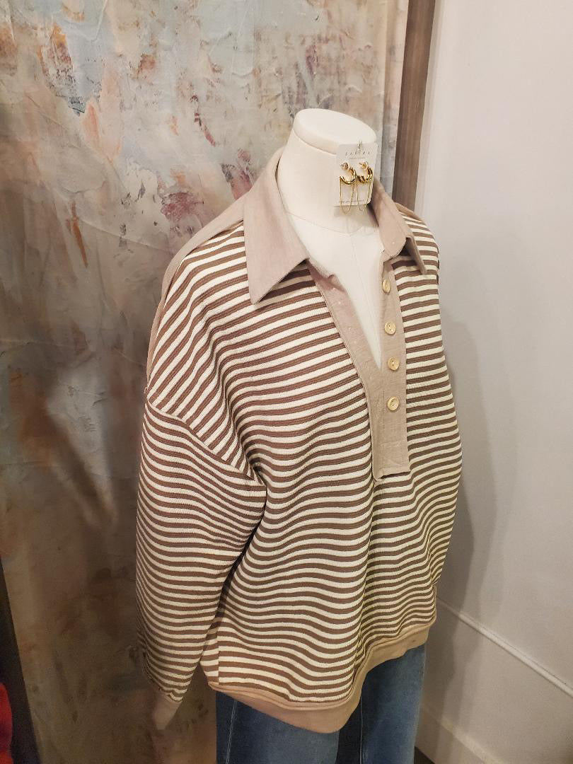 Introducing our Loose Fit Collared Stripe Top, designed for comfort and style. With its loose fit and collared neckline, this top offers a relaxed yet polished look. Perfect for any occasion, you'll love the effortless elegance this top brings to your wardrobe. Made with high-quality materials for lasting wear.