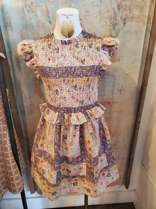 Print Woven Dress with Long Sleeve with Ruffle Hemline