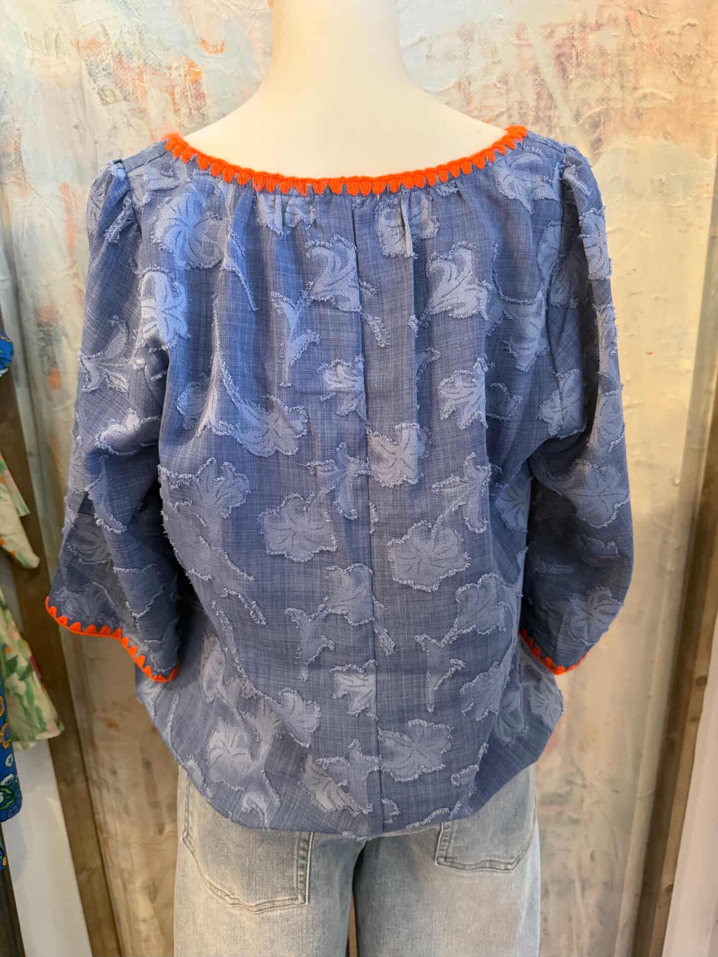 The Blue with Orange Detail Textured Top features a distinctive color combination and a textured fabric. This item offers a unique aesthetic appeal, enhancing visual interest while providing a comfortable fit. Its construction supports durability, making it suitable for both casual and semi-formal occasions.