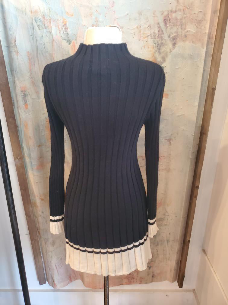 This sweater dress features a mock neck and contrast detailing on the bottom, creating a modern and stylish look. Made from high-quality materials, it combines comfort and fashion for a perfect addition to your wardrobe. Stay warm and on-trend with this versatile dress.