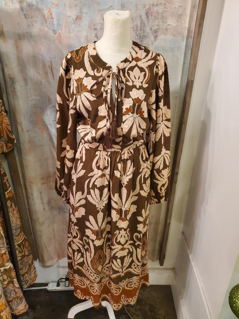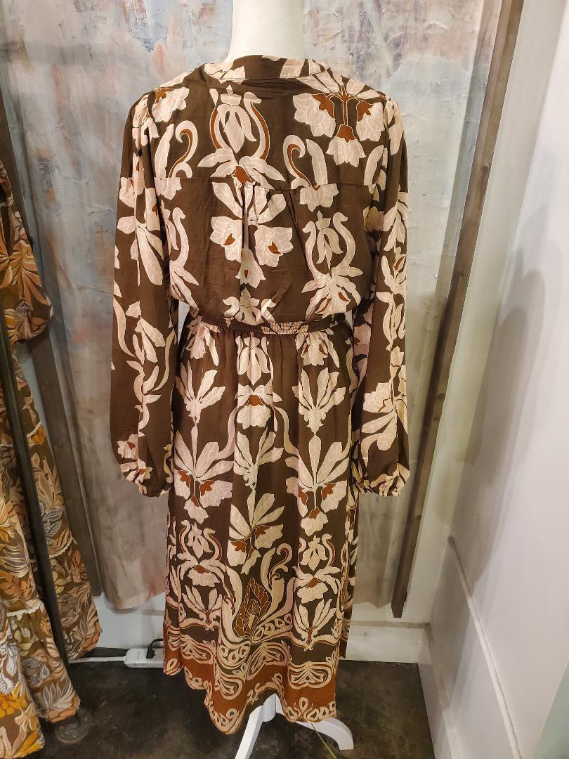 This elegant brown floral print midi dress offers a stylish and sophisticated look, perfect for any occasion. Made with high-quality materials, it provides comfort and durability. With its beautiful floral print, this dress is sure to make a statement and turn heads. A must-have addition to any wardrobe.