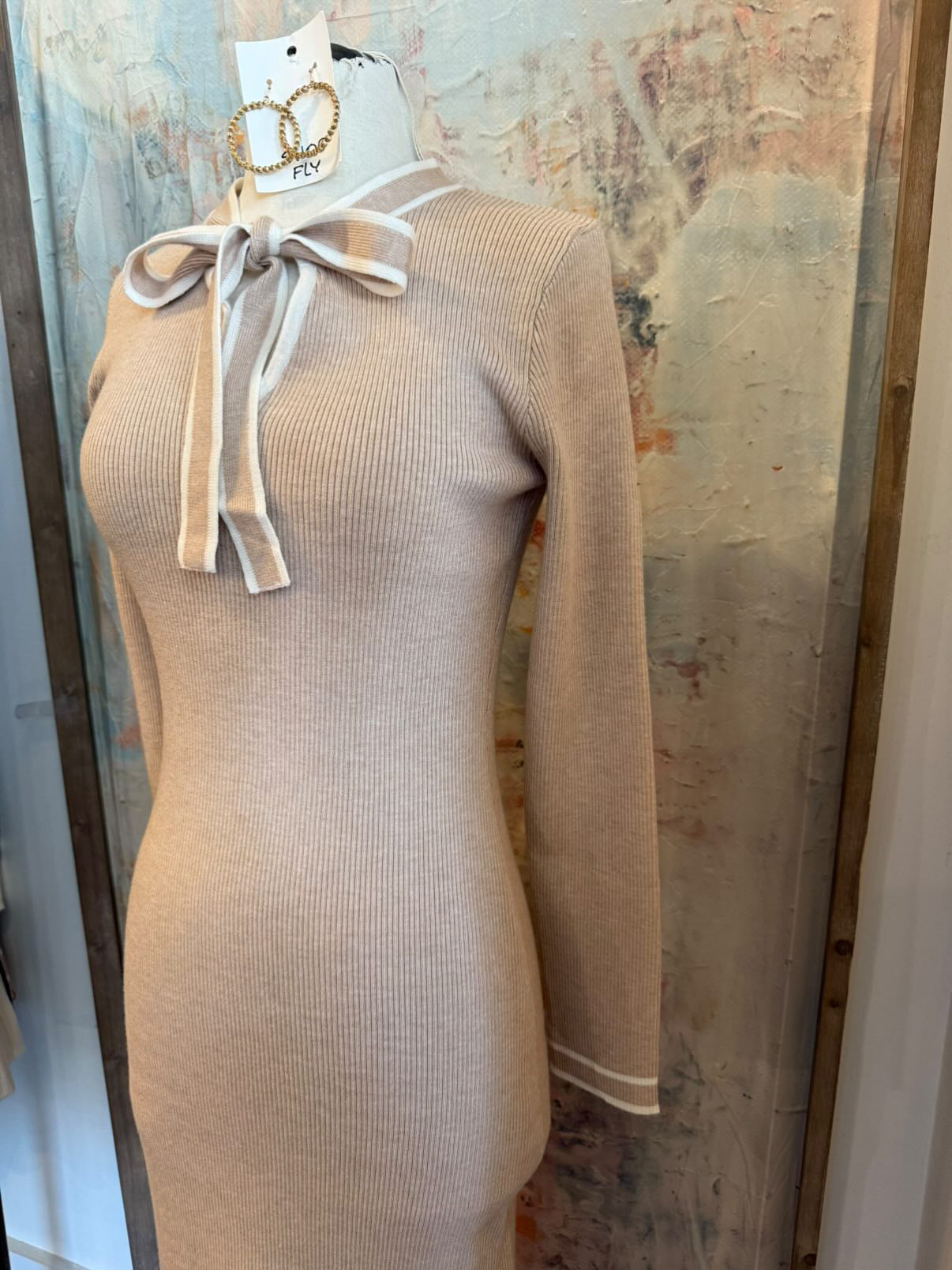 This Contrast Bow Detail Sweater Dress is the perfect addition to any wardrobe. Made from high-quality knit fabric, it features a contrast bow detail that adds a touch of elegance and sophistication. With a comfortable fit and stylish design, this dress is suitable for any occasion.
