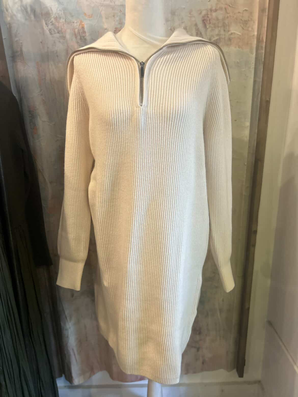 Stay warm and stylish with our Cream Zip Up Sweater Dress. Made with a cozy knit material, this dress is perfect for colder seasons. The zip-up design adds both functionality and style. Perfect for a casual day out or a cozy night in.