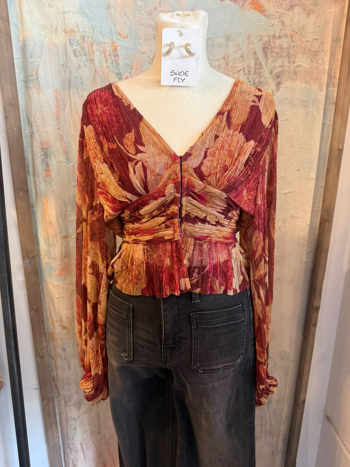 Expertly crafted with a luxurious crimson gold fabric, this long sleeve top offers both style and comfort. Perfect for any occasion, its elegant design and soft feel make it a must-have addition to your wardrobe. Elevate your look with this timeless piece.