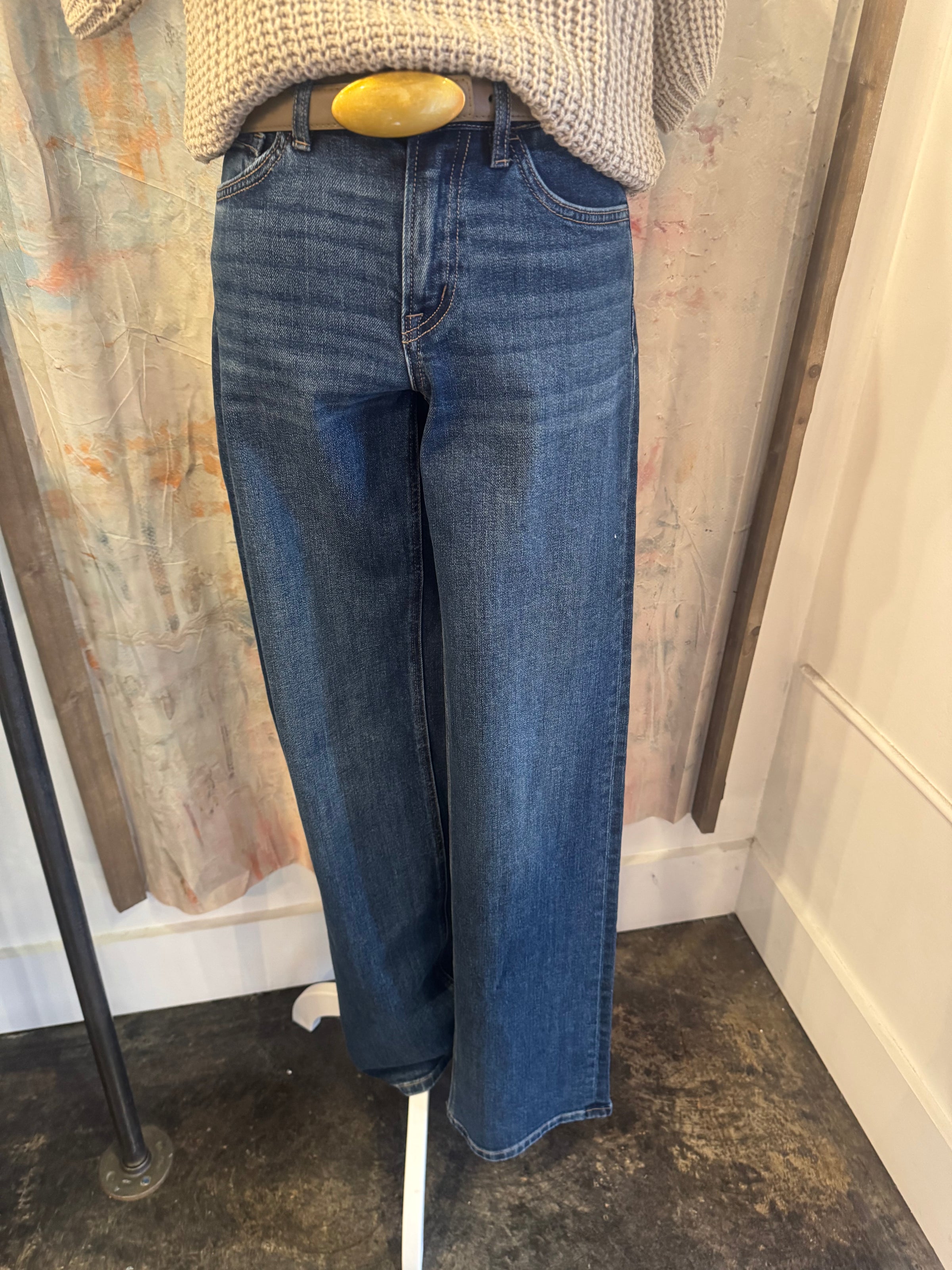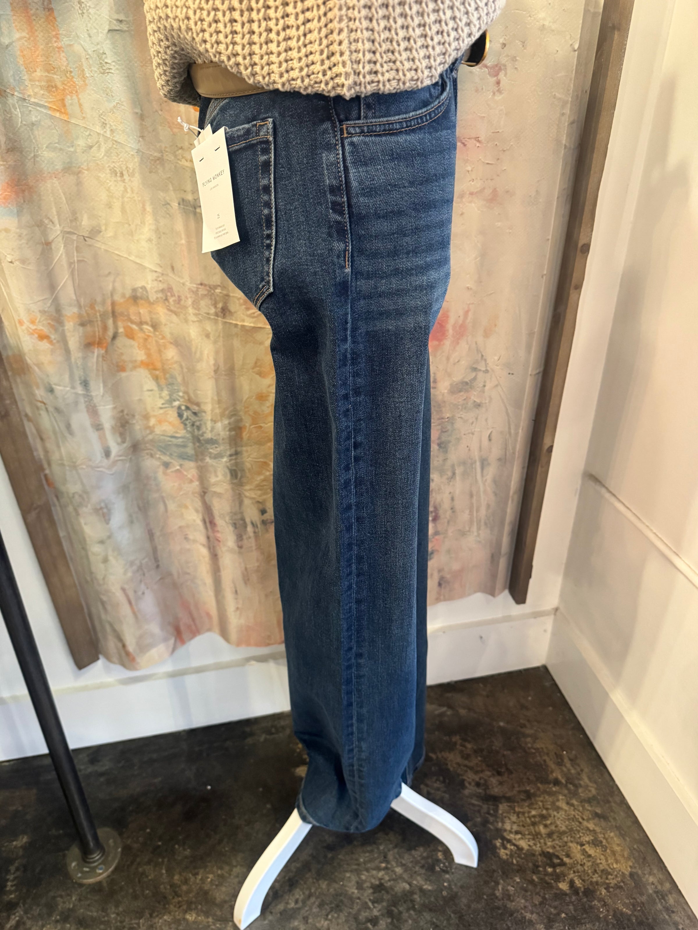 The Mid Rise Dark Wide Leg Denim features a contemporary mid-rise fit combined with a wide-leg design, promoting comfort and ease of movement. The dark wash not only provides a sophisticated aesthetic but also enhances durability, making it suitable for various occasions.
