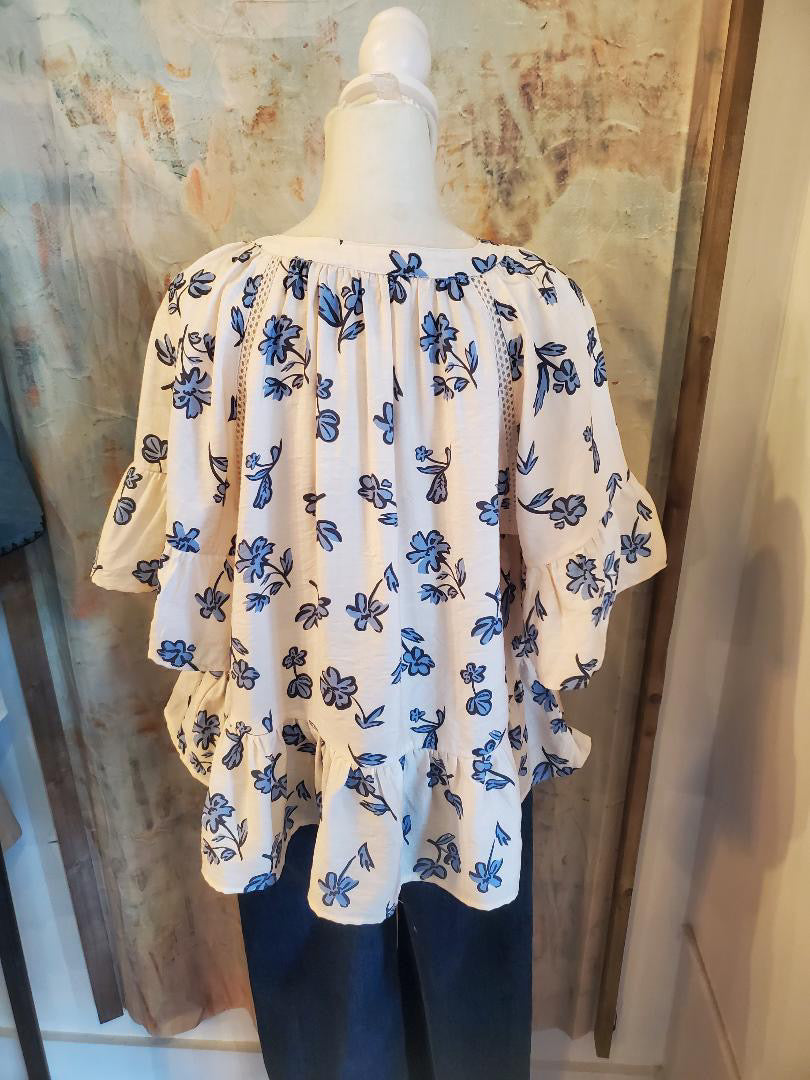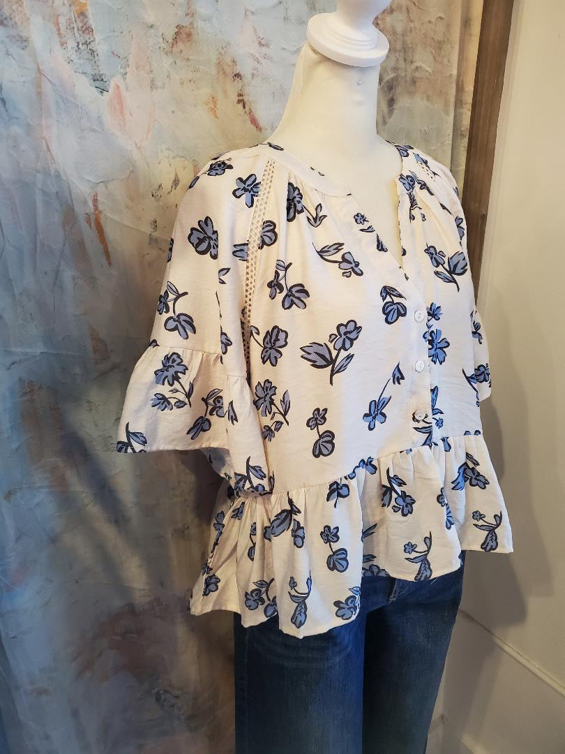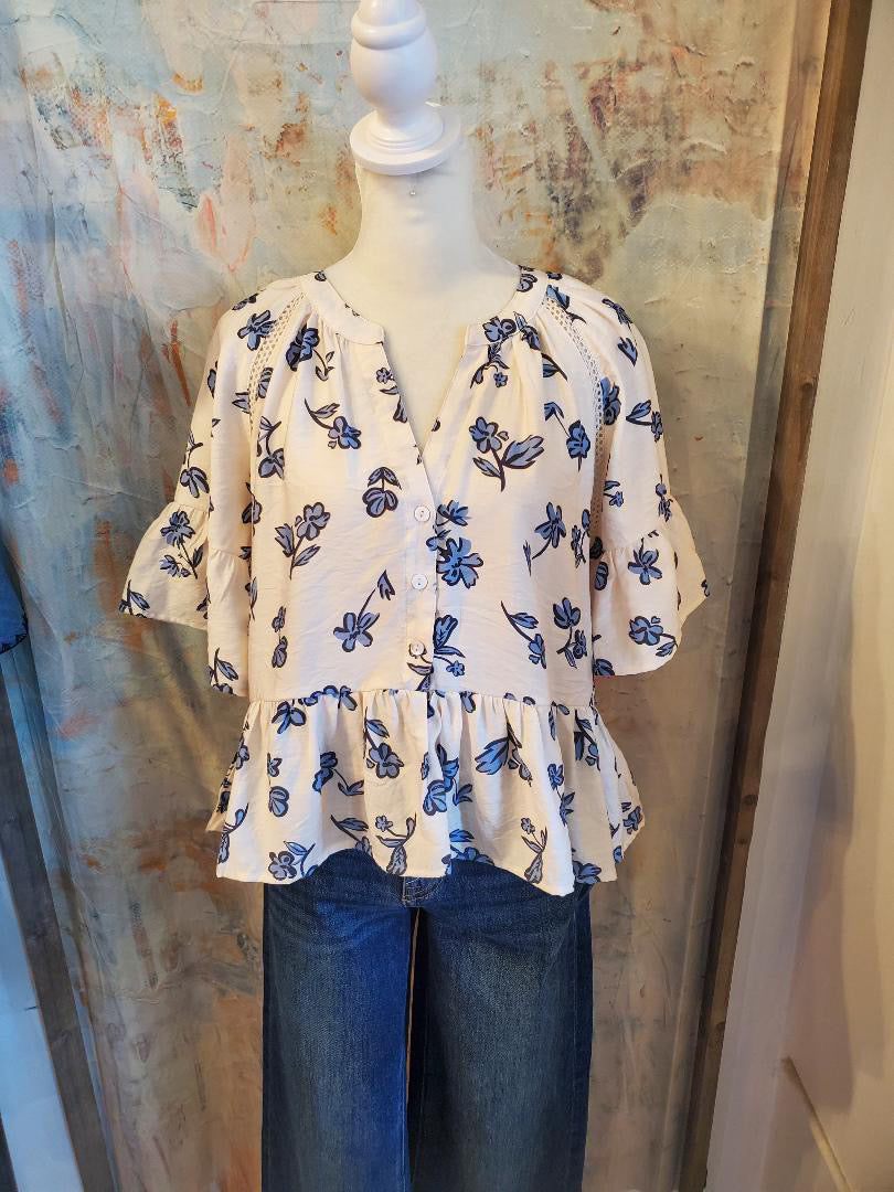 The Peplum Bottom Floral Top features a structured design that enhances the waistline while offering a relaxed fit. Its floral pattern adds a comfortable aesthetic suitable for various occasions. The peplum style can provide a balanced silhouette, making it a versatile addition to any wardrobe.
