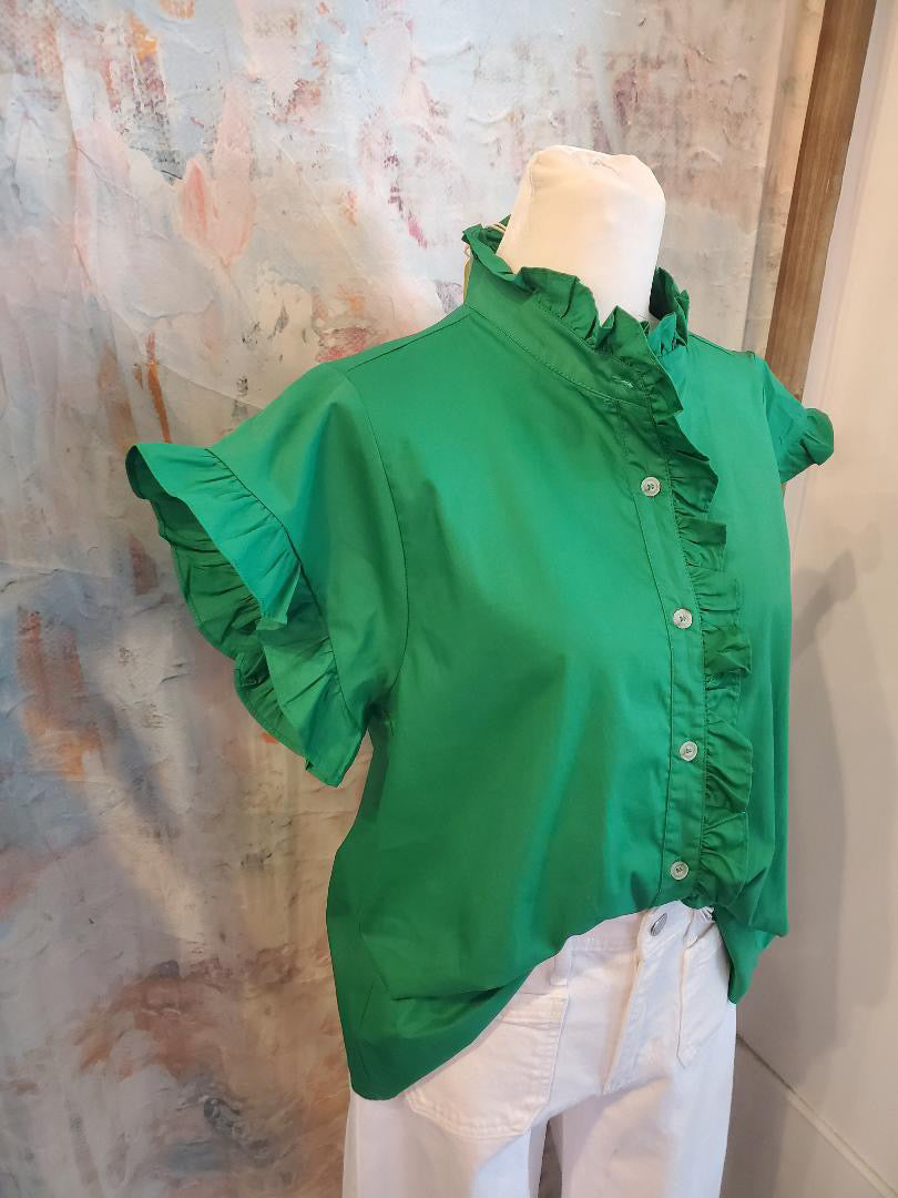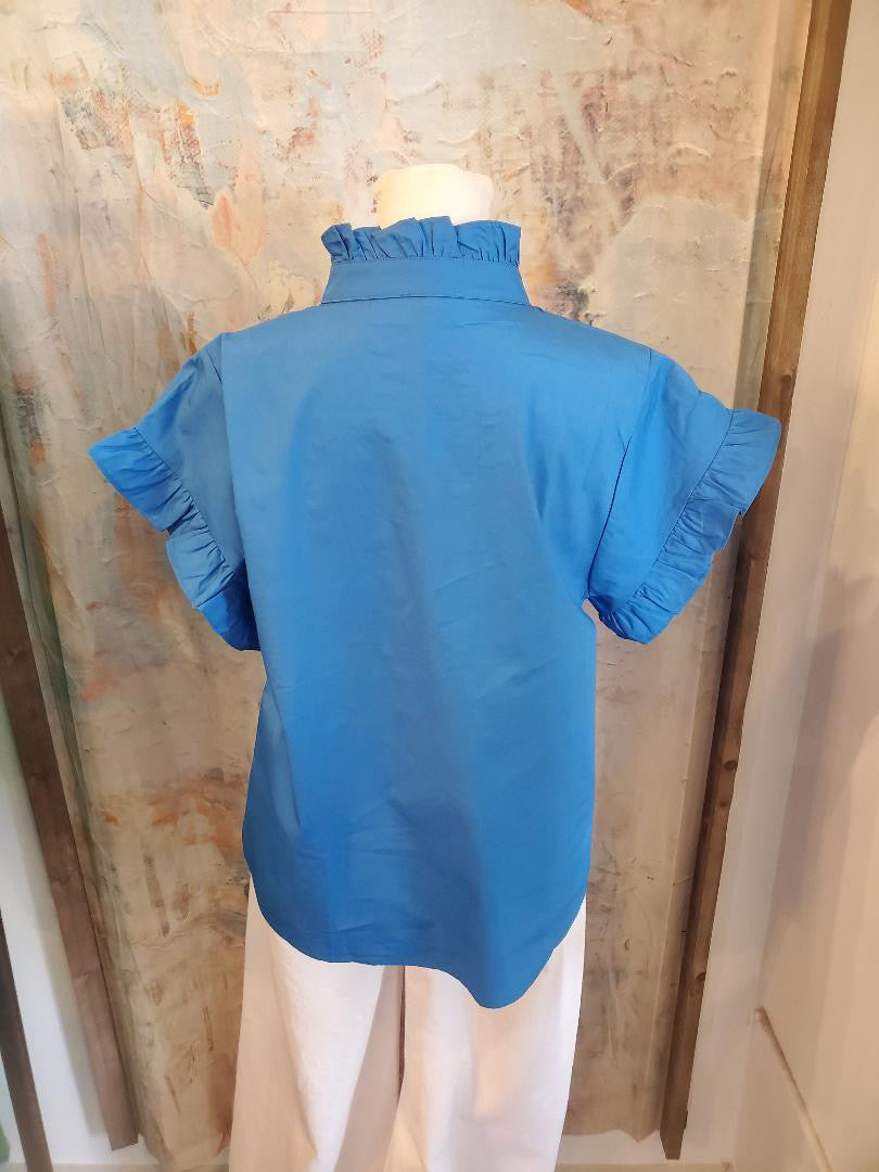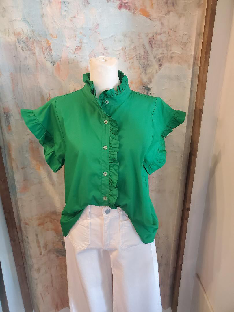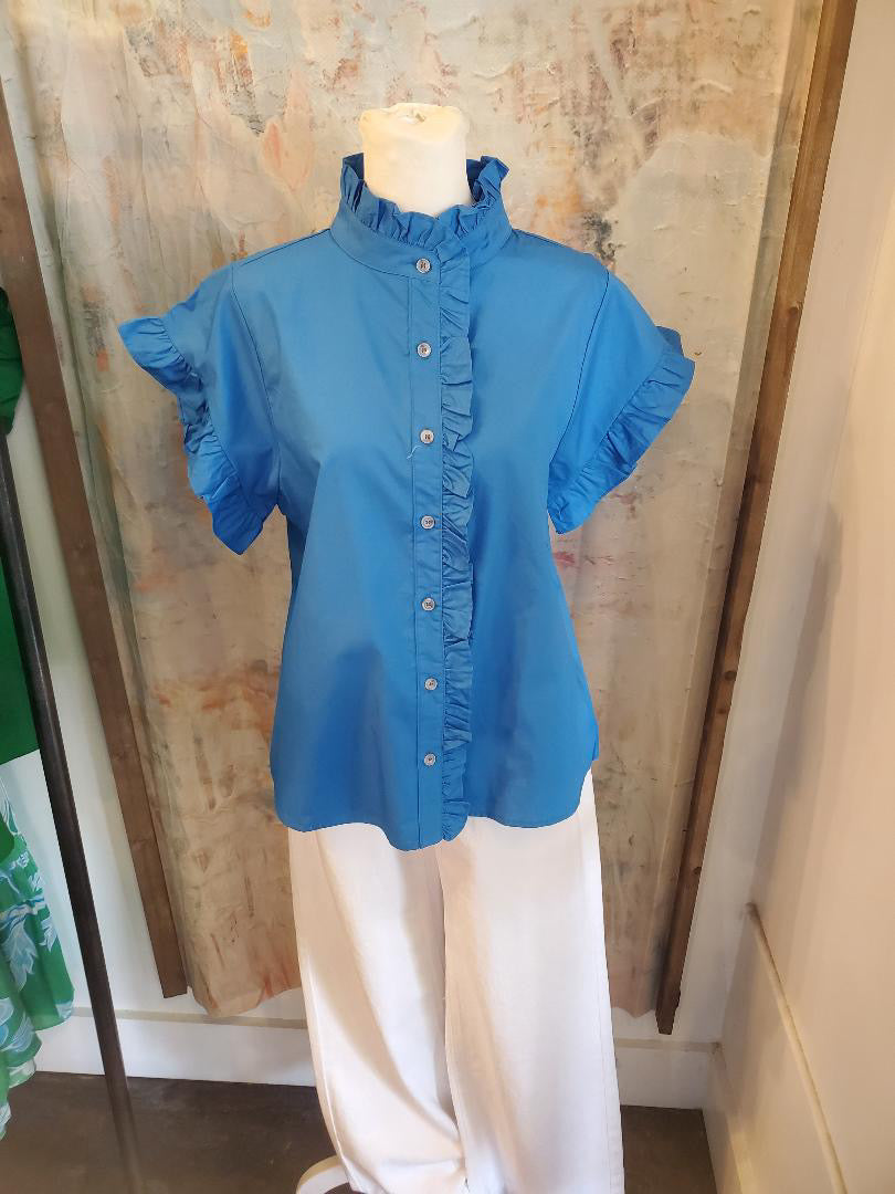 The Ruffle Detail Button Up Top features a carefully designed ruffle detail that enhances the garment's visual appeal while providing a sophisticated layer. This top combines aesthetic elegance with practicality, making it suitable for various occasions. Its button-up closure allows for versatile styling options, contributing to both comfort and formality.