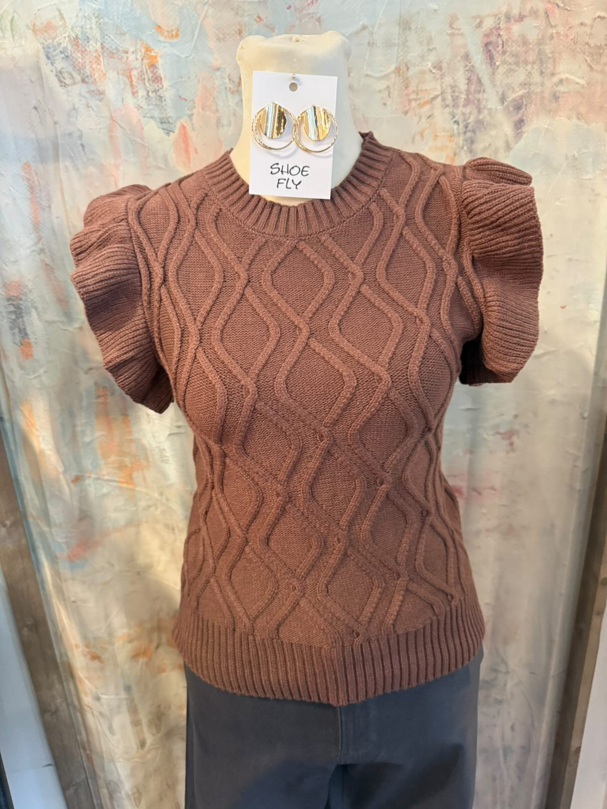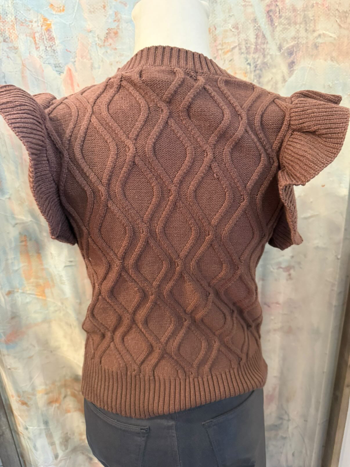 Introducing our Ruffled Sleeve Cable Knit Sweater Top - a versatile addition to your wardrobe. Made with soft, high-quality materials, it features stylish ruffled sleeves and a classic cable knit design. Perfect for any occasion, stay cozy and stylish with this must-have sweater top.