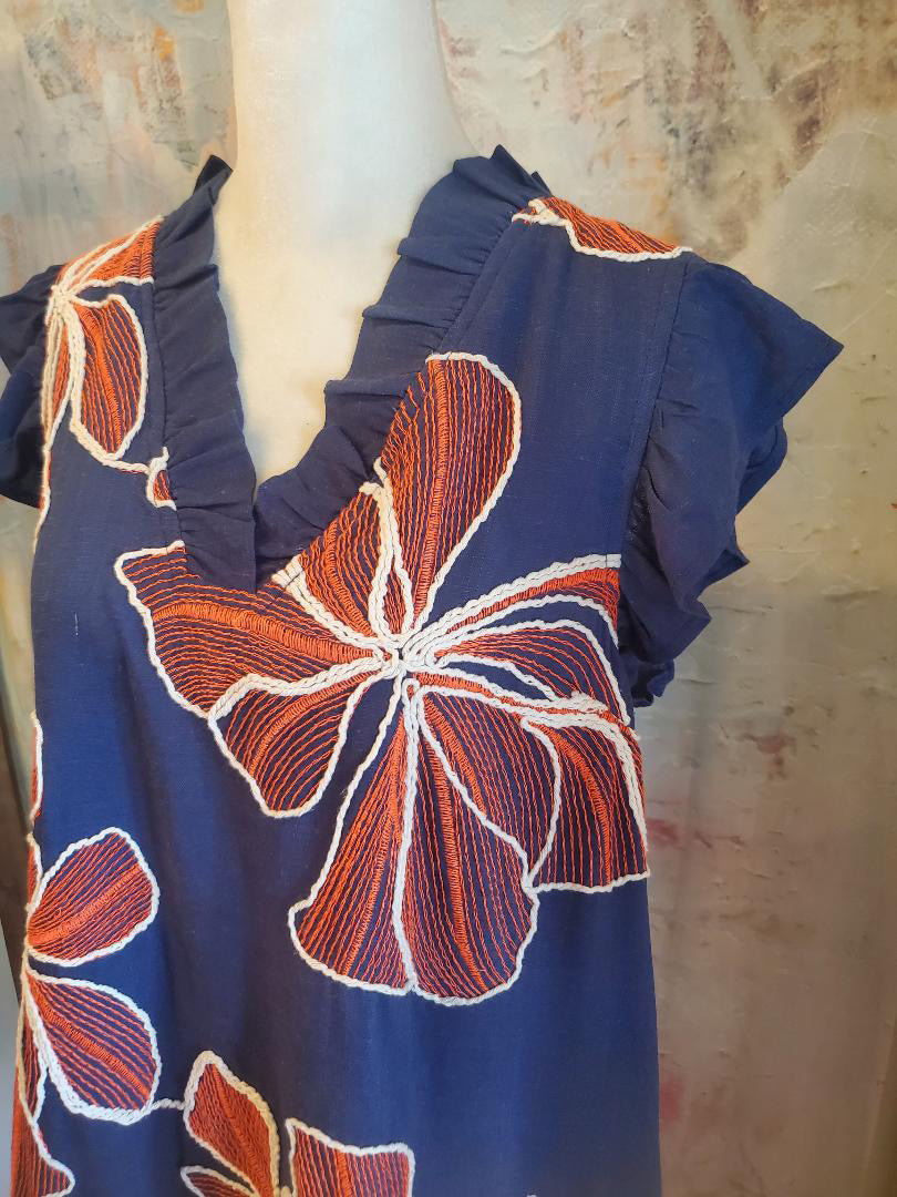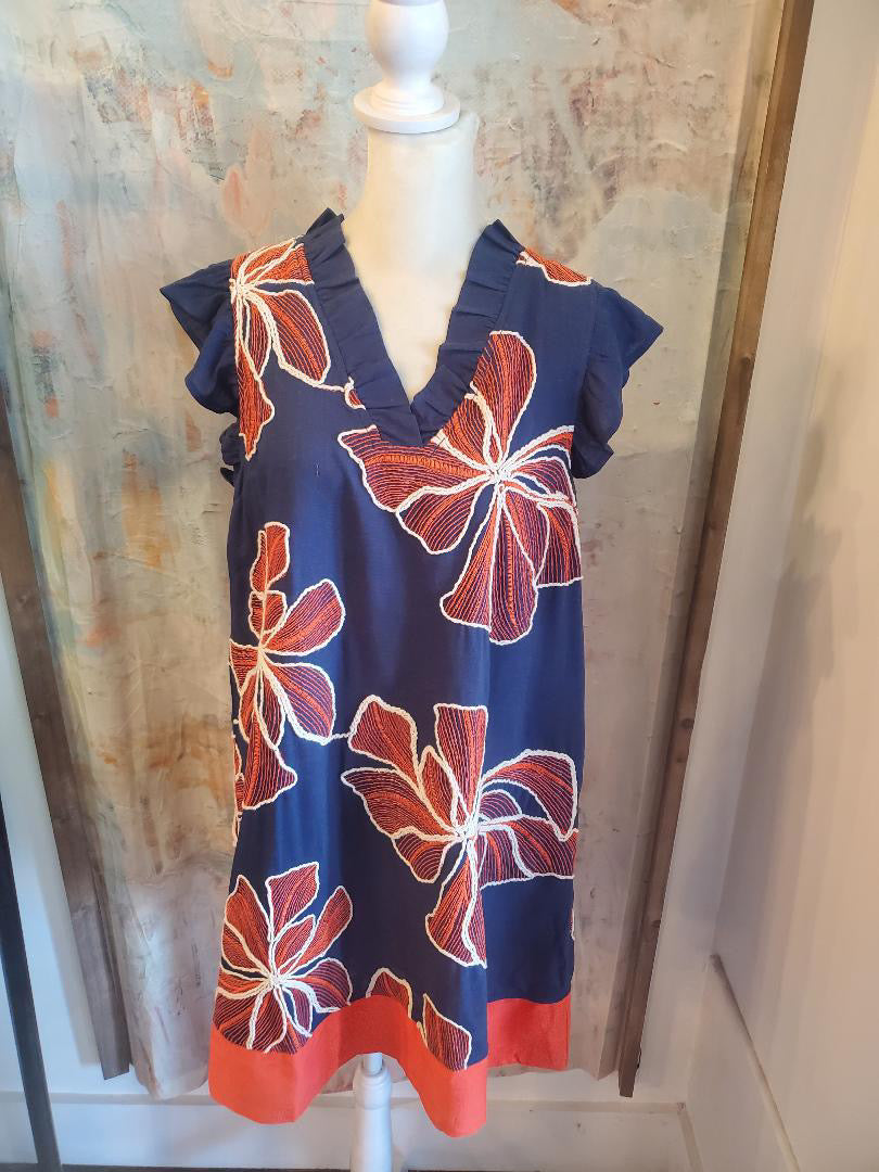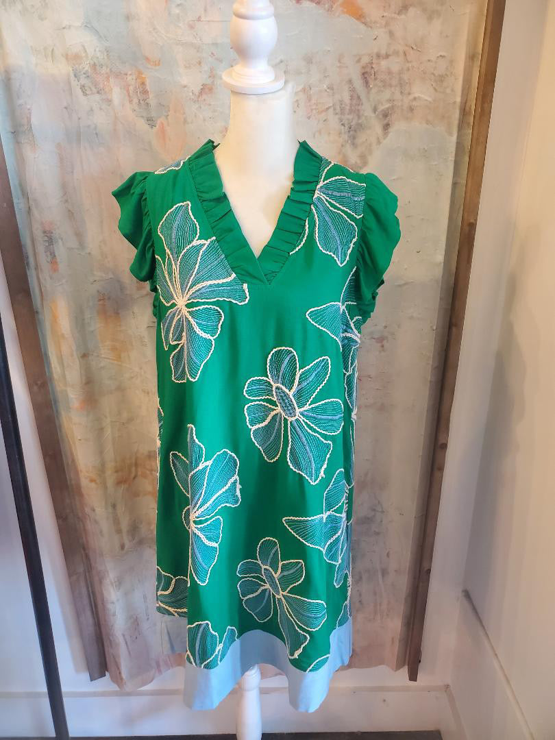 Ruffled V Neck Floral Embroidered Shift Dress