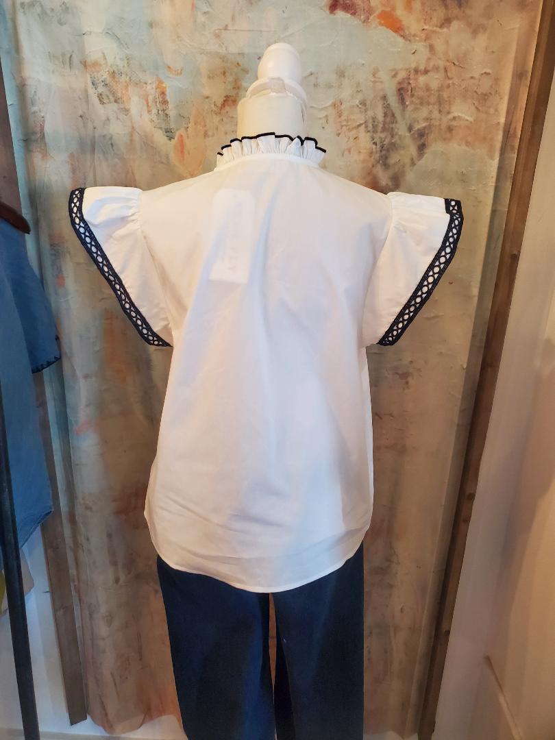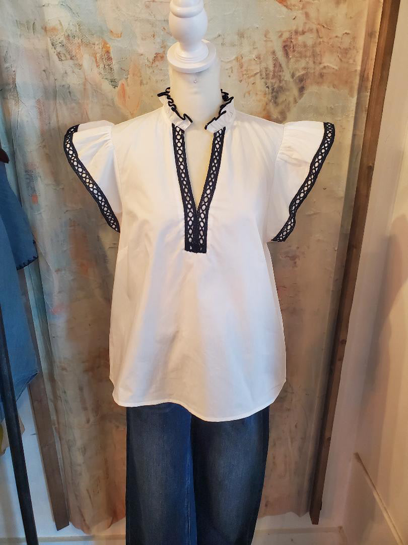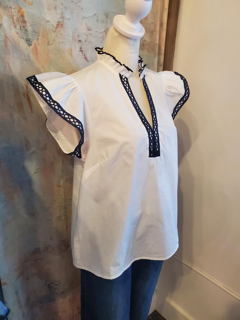 The Solid Woven White/Navy Border Top combines a classic design with versatile functionality. Its woven fabric offers breathability and comfort, while the navy border provides a refined contrast. Ideal for both professional and casual settings, this top enhances coordination with various outfits, supporting a polished appearance.