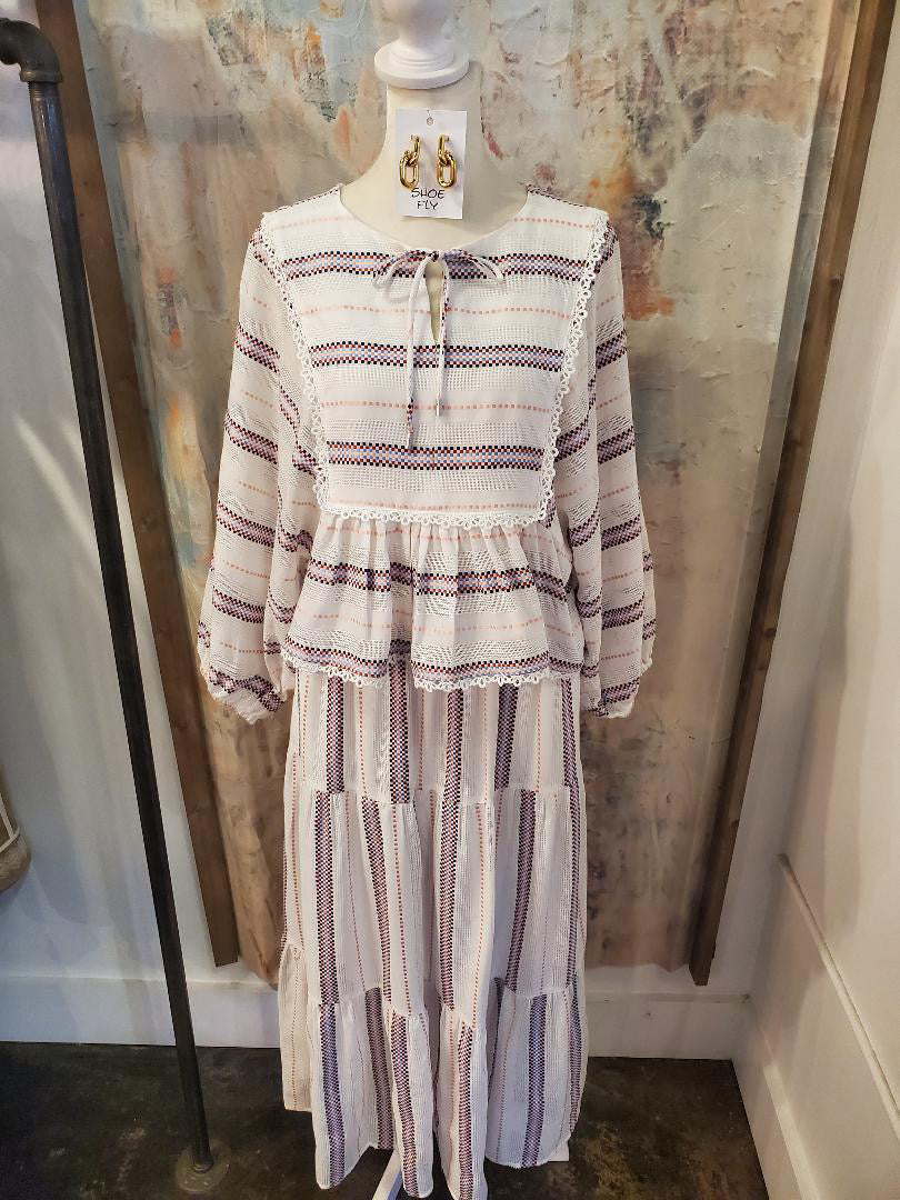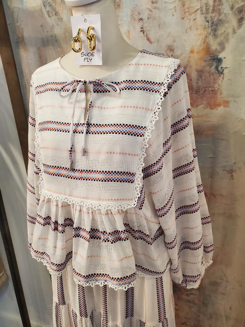 The Stripe Peplum Long Sleeve Top combines a classic stripe pattern with a peplum silhouette, offering both style and versatility. Its long sleeves provide coverage, making it suitable for various occasions. This garment can enhance your wardrobe by pairing seamlessly with both casual and formal attire.