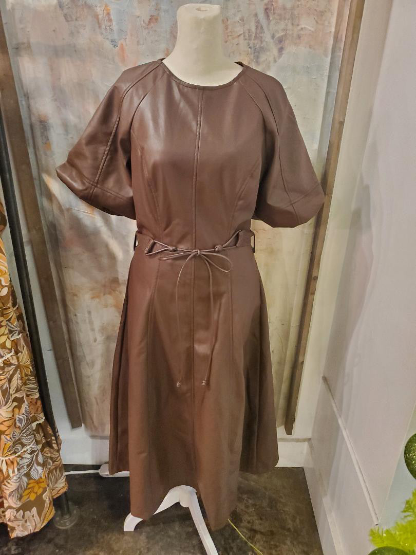 This Super Soft Faux Leather Dress features a stylish belt detail that cinches the waist for a flattering silhouette. Made from high-quality faux leather material, it offers a luxurious feel and timeless style. Perfect for any occasion, this dress will elevate your wardrobe with its elegant and versatile design.