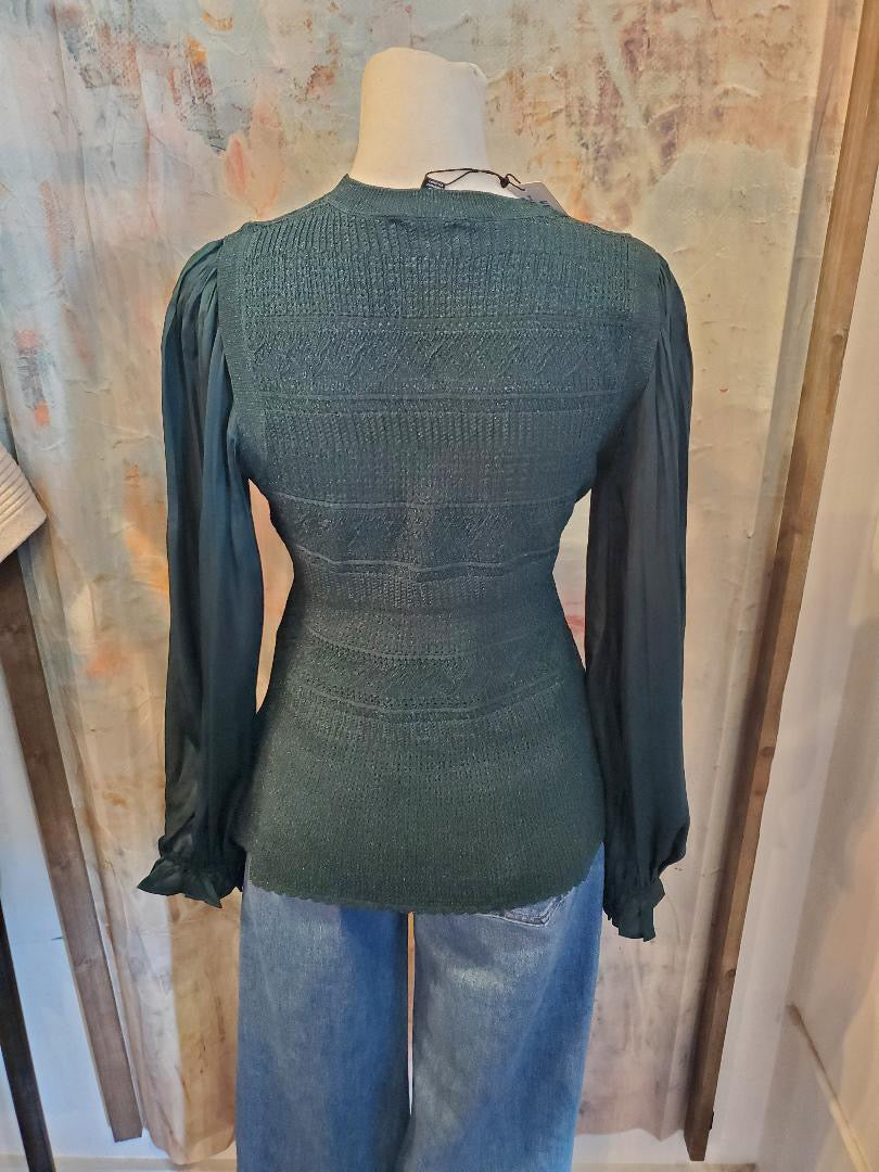 Teal Green Sweater Top with Pleat Sleeve Detail