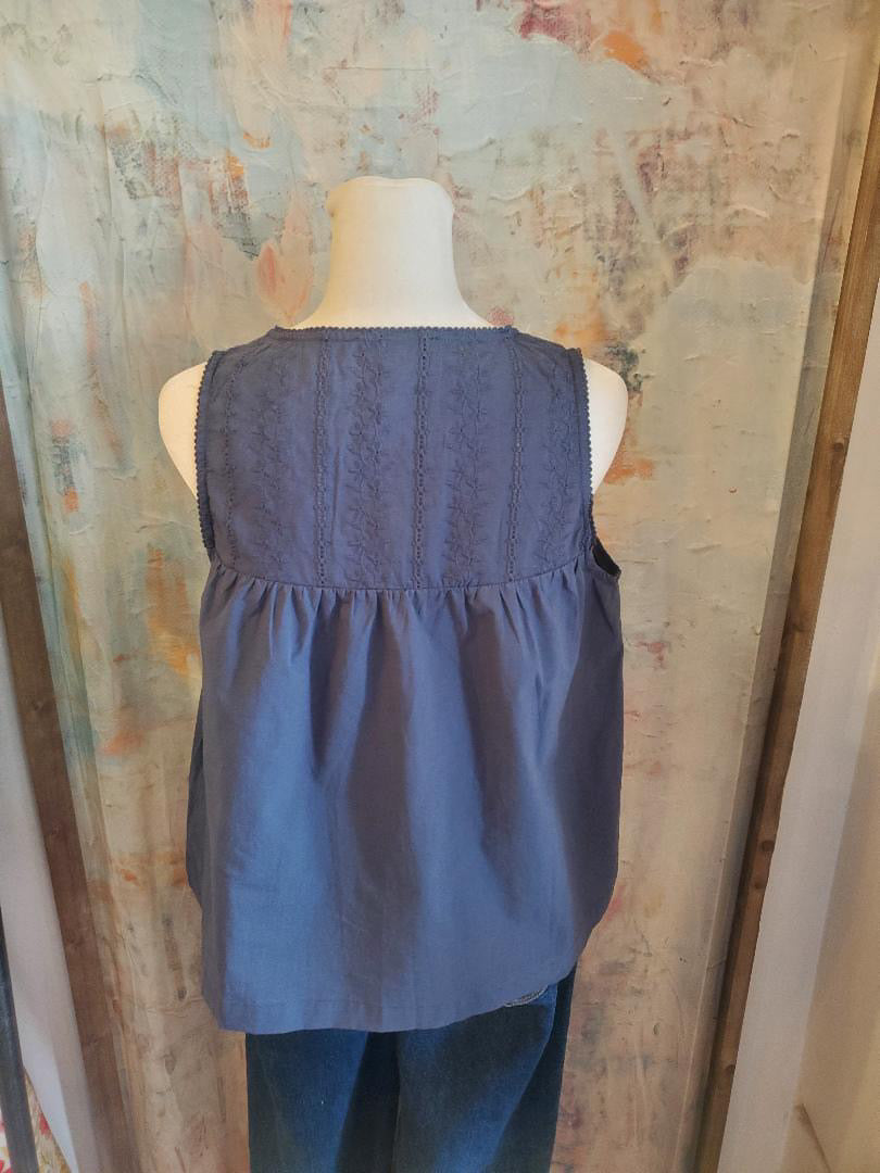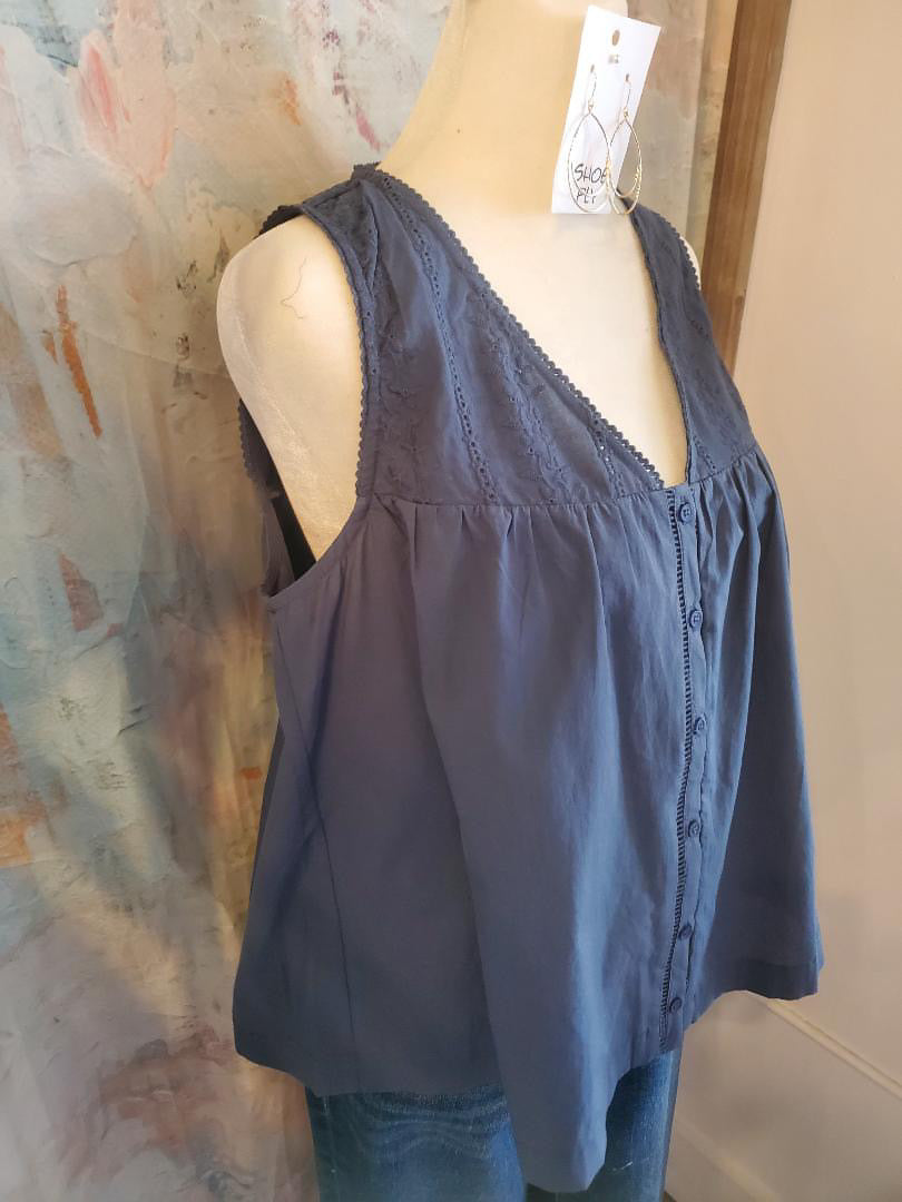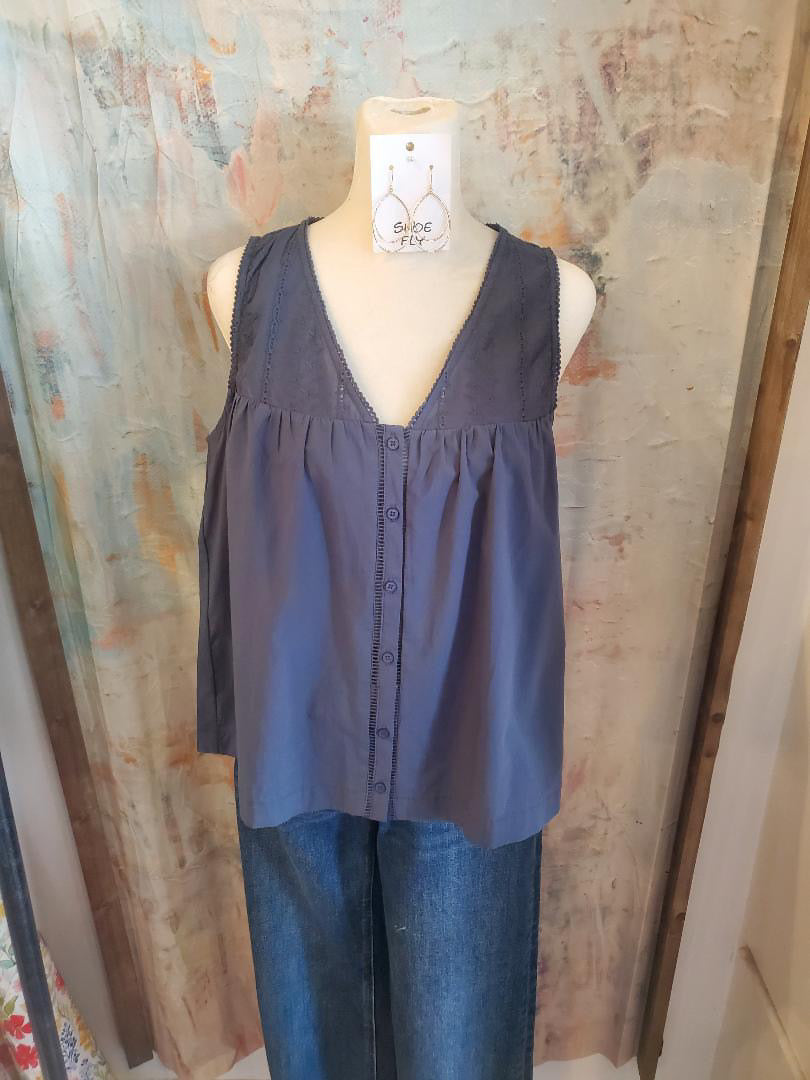The V Neck Eyelet Tank is designed for comfort and breathability, featuring a V-neckline that enhances ventilation. The eyelet pattern allows for increased airflow, making it suitable for warmer climates. This tank provides a versatile option for layering or wearing alone, promoting ease of movement and comfort throughout the day.