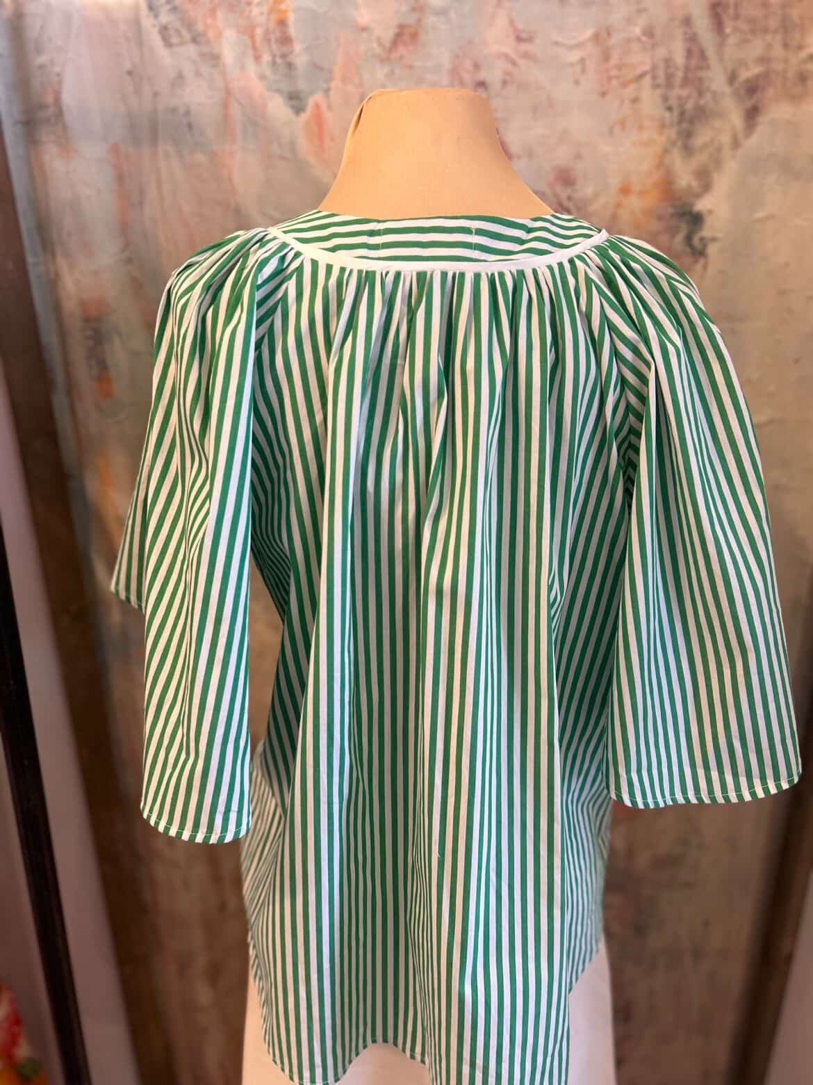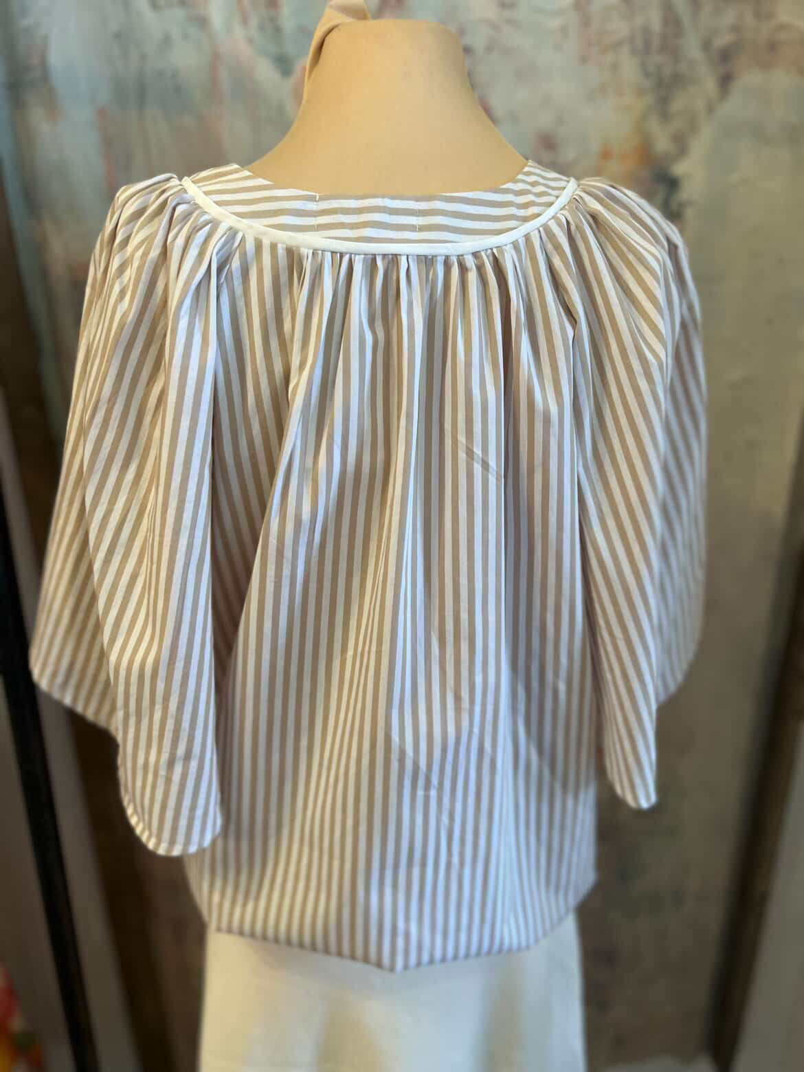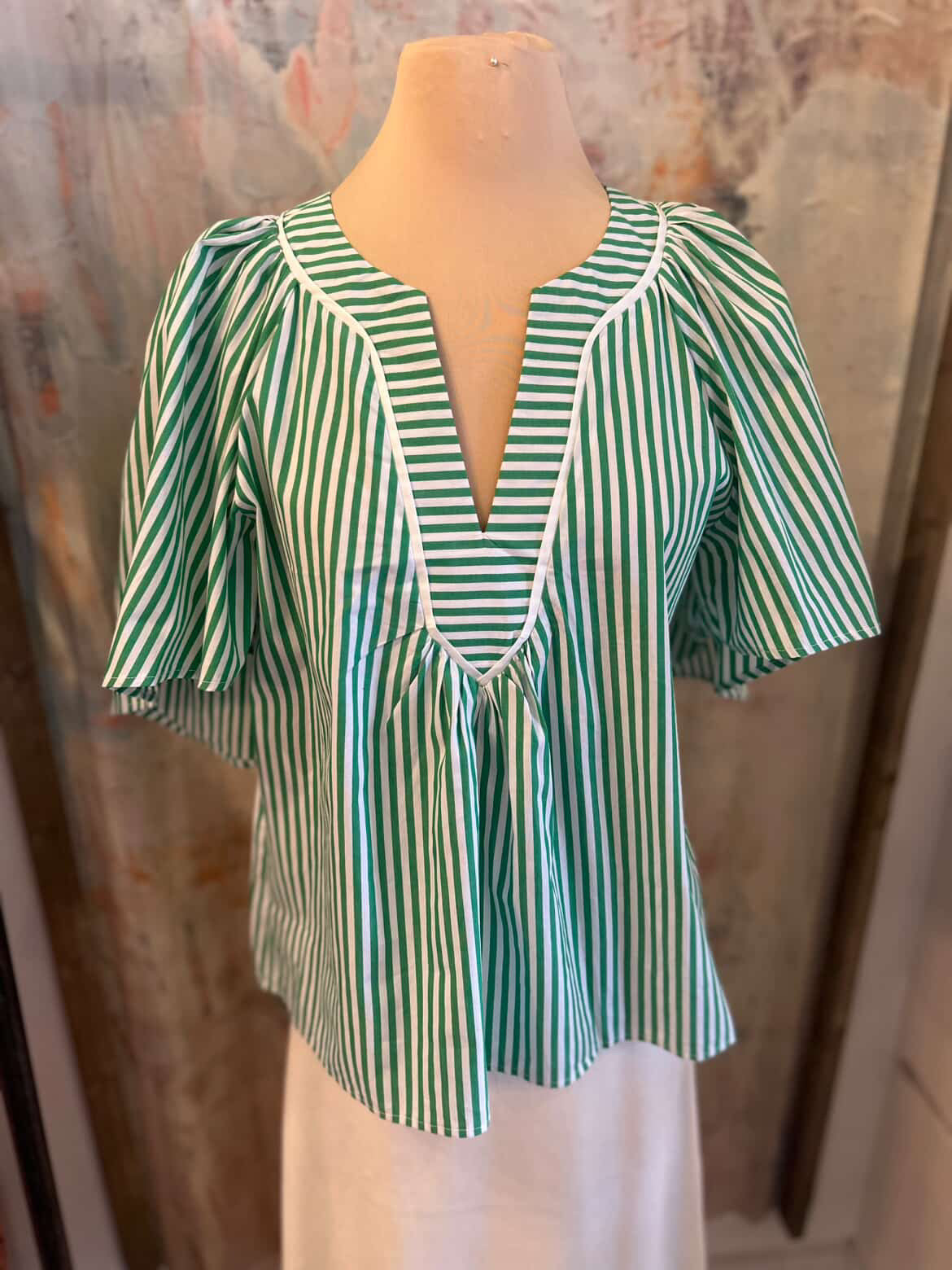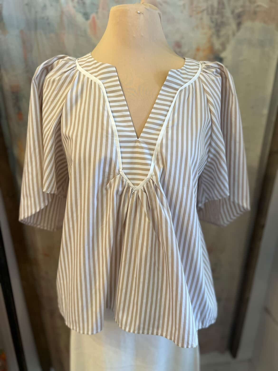The V Neck Oversized Flutter Sleeve Stripe Top features a contemporary design with an oversized silhouette and flutter sleeves, enhancing comfort and breathability. The stripes offer a classic aesthetic, while the V-neckline elongates the neckline. Ideal for casual wear, this top combines style with ease of movement and versatility.