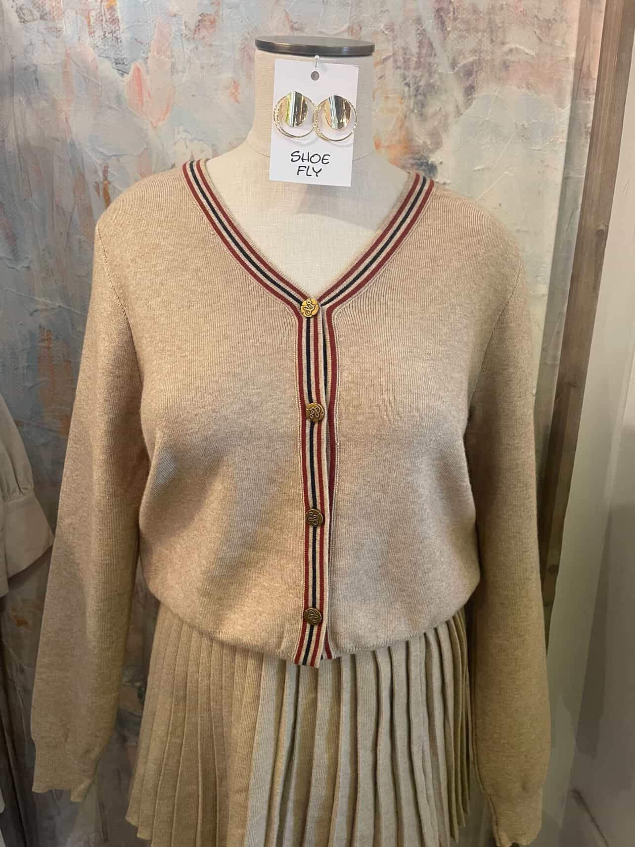 Stay cozy and stylish with our V Neck Stripe Detail Cardigan. Made with a classic v-neck design and eye-catching stripe details, this cardigan is perfect for any occasion. Enjoy the comfort and versatility of this wardrobe staple.